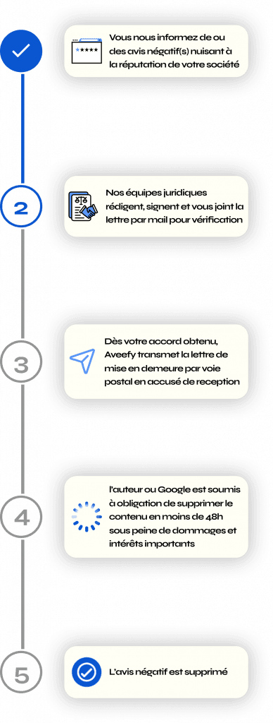 Avec Aveefy, vous pouvez être assuré que le processus de suppression des avis nuisibles sera fait proprement et que votre réputation en ligne sera protégé à long terme par des experts du secteurs, afin que vous puissier bénéficier d'une assistance proactive. Vous n'êtes toujours pas sûr ? Vous pouvez appeler notre assistance gratuitement pour évaluer la situation. Cela ne vous engage à rien.